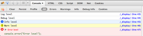 从Firebug控制台中可以看到,不同日志级别的打印信息,其颜色和图标是不一样的;同时,可以在控制台中选择不同的日志级别来对这些信息进行过滤: