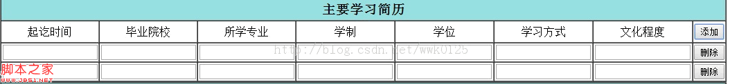 <td colspan="8" bgcolor="#96E0E2" style="height:30px;" ><h3 style="text-align:center; margin:0;">主要学习简历</h3></td>