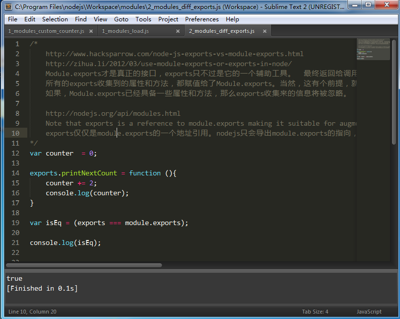 我在2_modules_diff_exports_load.js文件中输出了isEq的值 ( var isEq = (exports === module.exports); ),返回的true