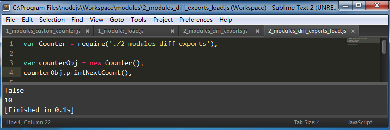示例中可以看到,我两次通过require('./1_modules_custom_counter')获取模块,但是第二次引用后调用printNextCount()方法确从60开始~~~