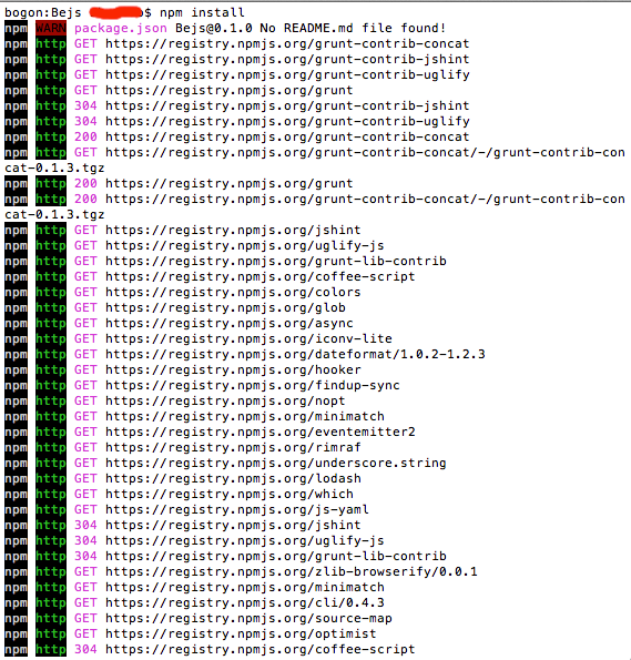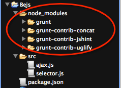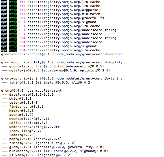 devDependencies中的grunt在前一篇已经安装了,grunt-contrib-jshint/grunt-contrib-uglify/grunt-contrib-concat则没有安装。三个分别对于三个任务(task)