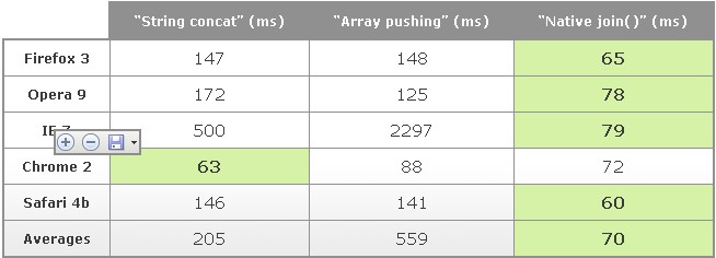 每种方法是使用一个长度为 130 的数组来测试,其中每个元素的长度是多种多样的,防止浏览器对一定长度的字符串做特殊的优化;每种方法测试了 1000 次;下面的结果显示,执行完这 1000 次需要的时间: