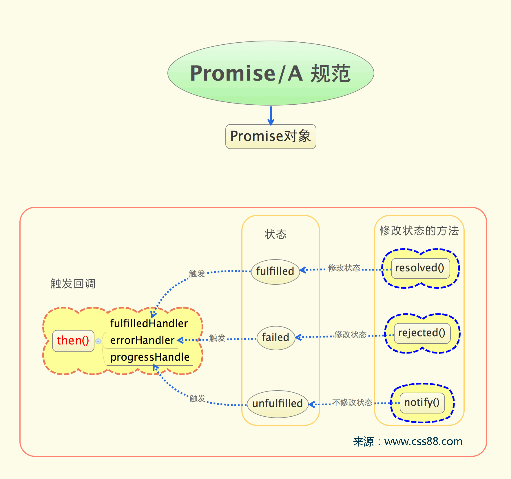 遵循Promises/A规范的实现我们称之为Promise对象,Promise对象有且仅有三种状态:unfulfilled(未完成)、fulfilled(已完成)、failed(失败/拒绝);初始创建的时候是unfulfilled(未完成)状态,状态只可以从unfulfilled(未完成)变成fulfilled(已完成),或者unfulfilled(未完成)变成failed(失败/拒绝)。状态一旦变成fulfilled(已完成)或者failed(失败/拒绝),状态就不能再变了。