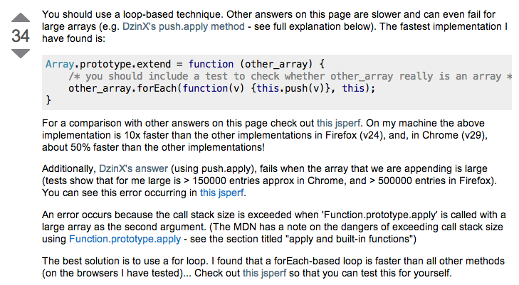 给出的建议是老老实实用forEach,不仅可以避免大数组的异常问题,并且从性能角度考虑forEach也是最快的
