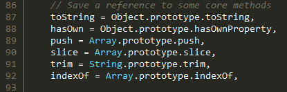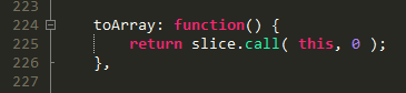 从源码中可以看到,这些常见的方法,都是直接从原生的javascript中"借鉴"过来的.为什么这么说呢?225行中,在运行时,this是指向jQuery对象的,通过call语句借鉴slice方法,切割出一个数组出来,这种"借鸡下蛋"的方法,真的是让人拍手叫绝.slice(start,end)是用来切分数组的.start表示切分数组的开始位置.省略end表示到从start一直到最后