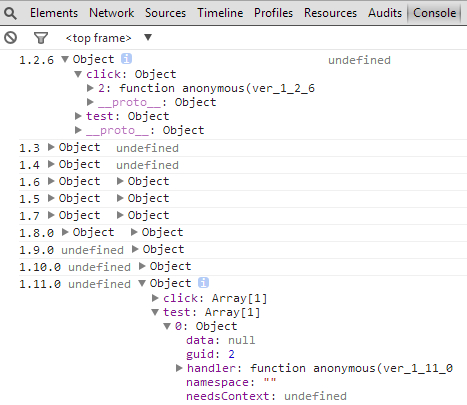 我们要说的重点是怎么定位到事件源码处。因为jQuery版本众多,而且重构过多次,所以要分情况来说了。