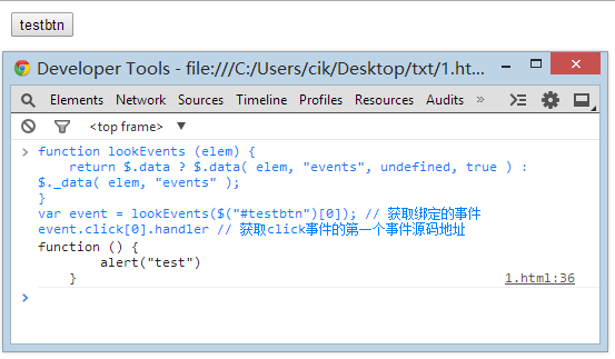 function lookEvents (elem) { return $.data ? $.data( elem, "events", undefined, true ) : $._data( elem, "events" );}var event = lookEvents($("#testbtn")[0]); // 获取绑定的事件event.click; // 查看有几个click事件,如果要查看其他事件直接输入 event 然后回车即可