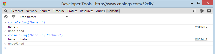 分别输入 console.log("hehe..") 和 console.log("hehe..", "haha..") 然后按回车,可以在控制台看到输出结果。