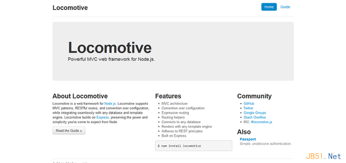 Locomotive是个强大的Node.js的MVC框架,支持RESTfu,可以无缝连接任何数据库和模版引擎。Locomotive是在Express的基础上建立的,保持了Node.js 强大而简单的功能。