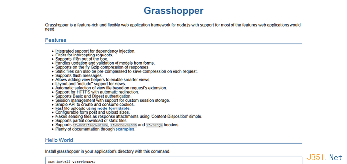 Grasshopper是一款功能丰富且非常灵活的Node.js框架,基本上支持所有的Web开发特性。推荐一个学习示例给大家。