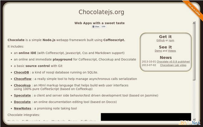 Chocolate.js是一个基于Node.js,使用CoffeeScript构建的简单的Web应用框架(集合)。 想学习该框架的同学可以到这里对其进行全面了解,并且里面有大量的示例。