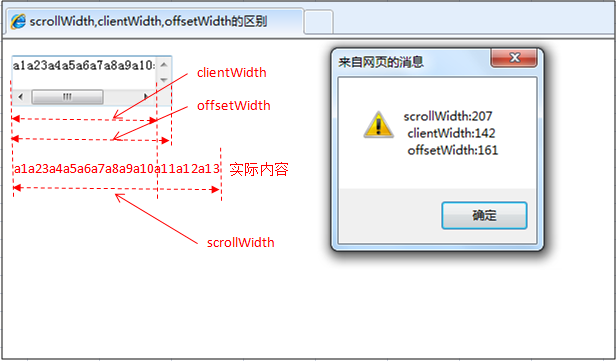 scrollWidth=clientWidth,两者皆为内容可视区的宽度。