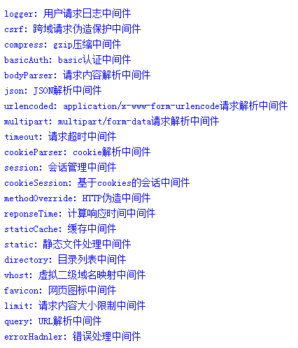 (3),通过上述的几个中间件例子,理解用途和使用场景并且参考相关文档掌握其余中间件的基本使用。