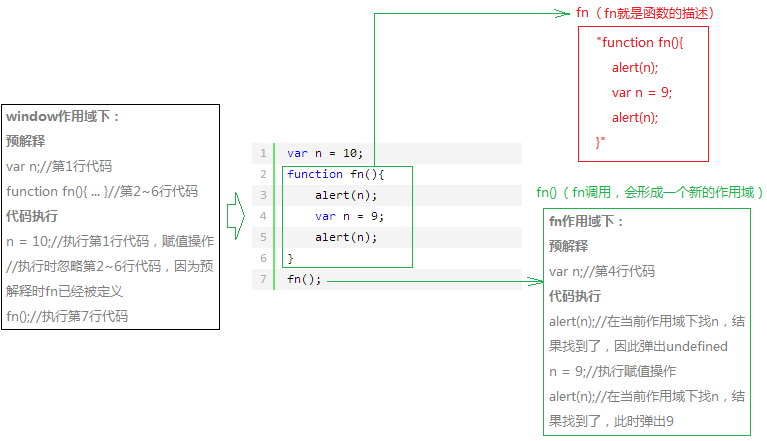 从图中我们看到了两个作用域,一个是window作用域(顶级作用域),一个是fn调用的时候形成的一个私有作用域;那什么是作用域,作用域其实就是代码执行的环境。举个栗子,一个学生他的学习环境是学校,相当于他的作用域是学校,假如这个学生很调皮,晚上经常FanQiang去网吧打游戏,相当于形成了一个私有环境,这个作用域就是网吧。好吧!这个栗子太TM像撸主本人了,不由感叹一句:“少壮不努力,长大干挨踢”。还是回到正题,其实函数fn的定义就是指向一段代码的描述(图中红框),当这个fn调用(图中的绿框)的时候,就会形成一个作用域,当然这个作用域中的代码执行前也会预解释,我是不会告诉你这个作用域是当它执行完毕后会被销毁,这个fn再次调用也会形成一个新的作用域,然后执行前预解释,然后代码执行,最后执行完毕销毁。