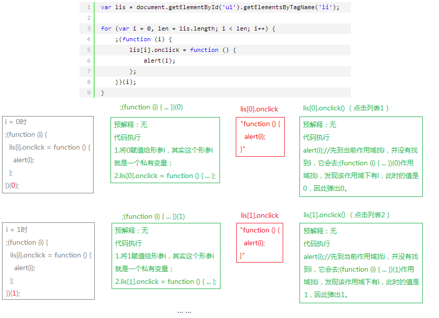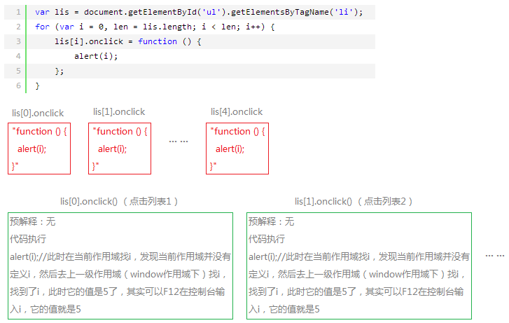 我详细的对整个代码执行做了描述,需要注意的是:每个li的onclick属性都要占用(function(i){ … })(i)作用域,当这个函数执行完毕后不会被销毁,因为它被外面的li(这个li是window作用域下的)占用着,因此这个作用域不会被销毁。当点击任意一个li时,function(){ alert(i); }会被执行,也会形成一个作用域,这个作用域没有i,它会去(function(){ … })(i)作用域找i,最终在形参找到i,这个形参i的值就是for循环时传进去的;这个例子巧妙地使用闭包来贮存值,完美解决问题。