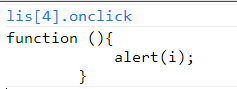 在Chrome控制台下输入:lis[4].onclick,其值就是函数的描述。当我们在点击第5个列表时,其实就是相当于lis[4].onclick(),调用了这段函数描述,我们知道函数在被调用执行的时会形成一个私有作用域,在这个私有作用域下也是先预解释,然后代码执行,此时会去找i,在当前私有作用域下没有i,然后去window作用域下找到了i,因此每次点击都弹出5。