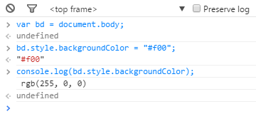 问题一,当我们在进行网页前端开发的时候,经常会使用 dom.style.backgroundColor = "#f00" 来设置某个 DOM 元素的背景颜色,也会通过类似(为什么是类似?情况比较多,这里可以自由发挥想象) var bgc = dom.style.backgroundColor 的代码来获取某个 DOM 元素的背景颜色。那么问题来了,请看下图: