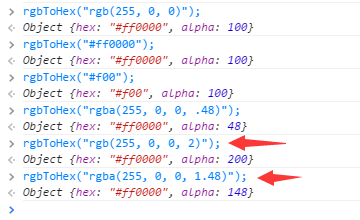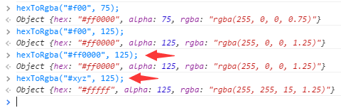 从执行结果来看,我们的方法似乎已经能够达到我们的目的了。但是,细心的朋友应该注意到了图中有两个红色箭头,这里是不是有什么坑?不错。我们仔细看看第一个箭头中传入的颜色参数 rgb(255, 0, 0, 2),其实这里并不是一个合法的颜色值,rgb格式的颜色值,是没有第四个(透明度)参数的;再看第二个箭头中 rgba(255, 0, 0, 1.48),这里格式是没问题了,但是透明度却为1.48,其实不是一个合法的透明度值。这两种情况,我们的方法都正常执行了,也正常返回了,说明,我们的方法还有进一步进化的空间,就交给大家自行发挥了!