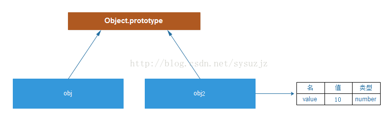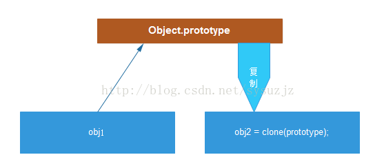 我们只要在系统中指明obj1和obj2等同于它们的原型,这样在读取的时候,只需要顺着指示去读原型即可。当需要写对象(例如obj2)的属性时,我们就复制一个原型的映像出来,并使以后的操作指向该映像即可。如图: