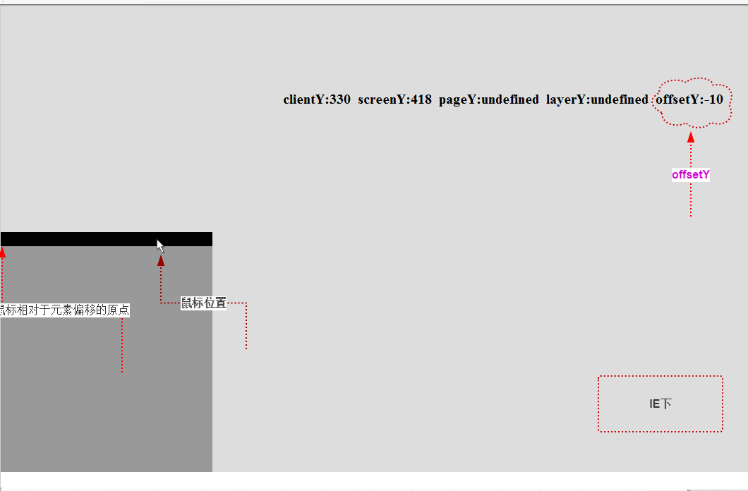 offsetY和layerY的不同在于,前者的在计算偏移值时,相对于元素的border左上角的内交点,因此当鼠标位于元素的border上时,偏移值是一个负值。 另外offsetY并不在乎触发事件的元素是否有定位属性,它总是相对于触发事件的元素来计算偏移值。