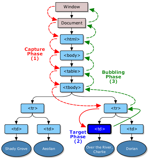 由上可以看出来,假如不停的删除或添加li,则function()也要不停的更改操作,易出错,因此推荐使用事件代理,在使用事件代理之前,我们先来了解一下事件阶段(event phase):