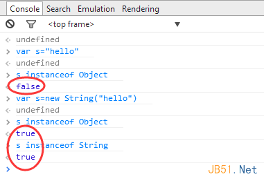 如果你懂了上面我说的原理,那么你对console.log(s.color)等于undefined 就不足以为奇了,我们可以看到,当我使用s.color="red"的时候,js引擎发现有调用属性的写法,会立即在后台动态让其包装成String类型,然后就给String下面新增了一个属性color=red,然后内部立刻会重新设置s的值为“hello”(s="hello"),接下来当你console.log来输出s.color时,js引擎判断又有调用属性的写法,再次new String("hello")了下,自然在这个新的String类型下面是没有color属性的,所以返回undefined了。