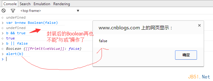 如果你懂得了String这个包装类,那么其实Boolean包装类跟它是一个原理,只不过在Boolean类型的使用中,是有一个注意事项的,我们知道一个引用类型,除非它是null或者undefined,否则它永远都是true,而这个Boolean类型正是做了这个box操作,如下图: