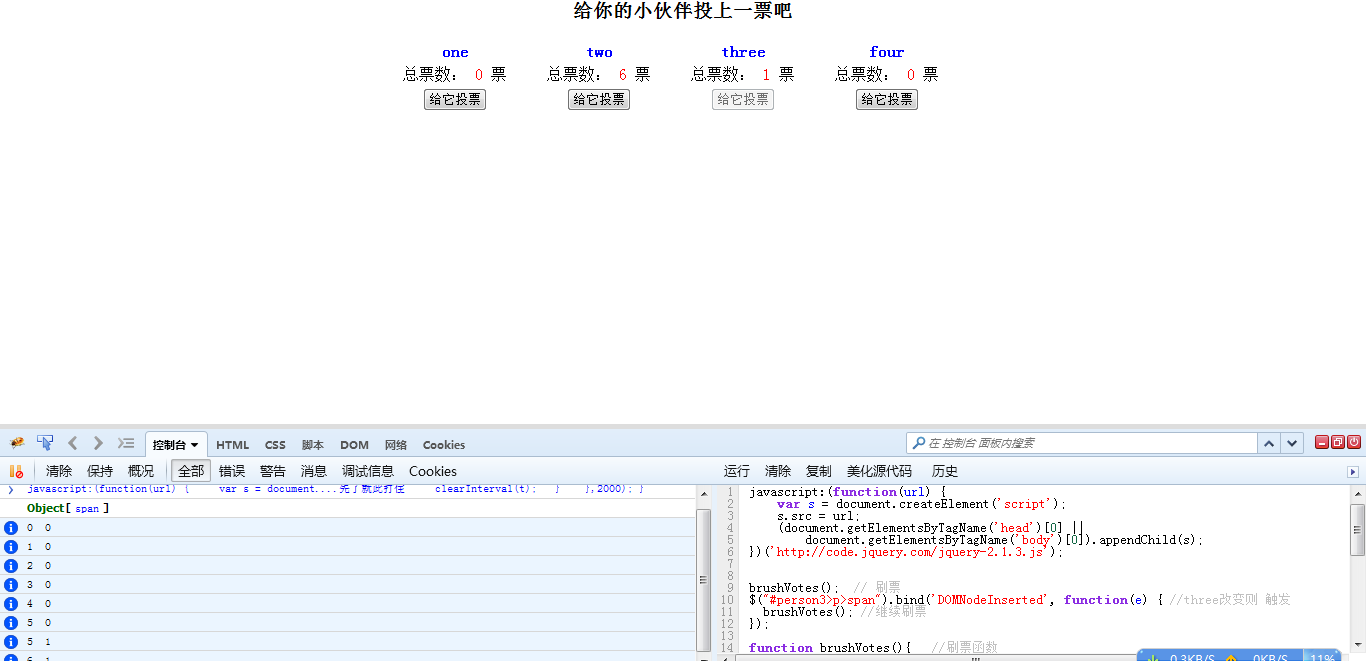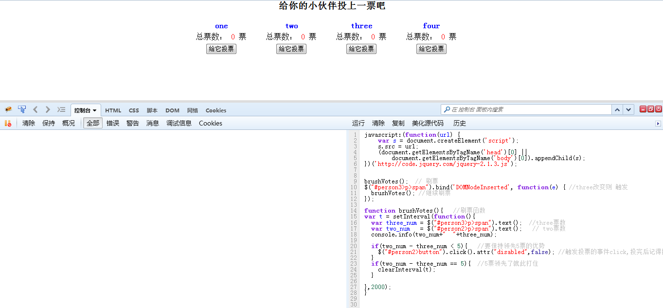 1.进入投票页面,调出Firebug,在控制台右边代码输入区键入完整代码