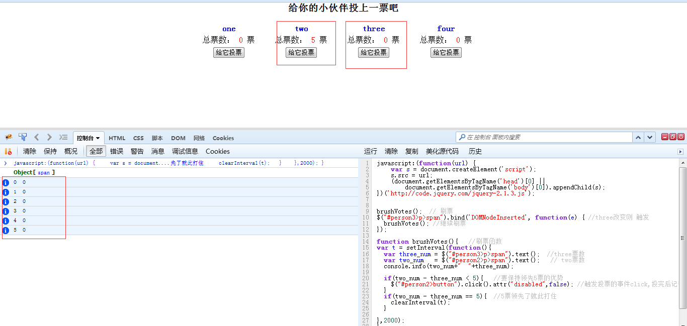现在,我想给two刷票,每两秒钟就给他投一次。我的目的是让two的总票数要保持大于three的(当然,随你怎么想)