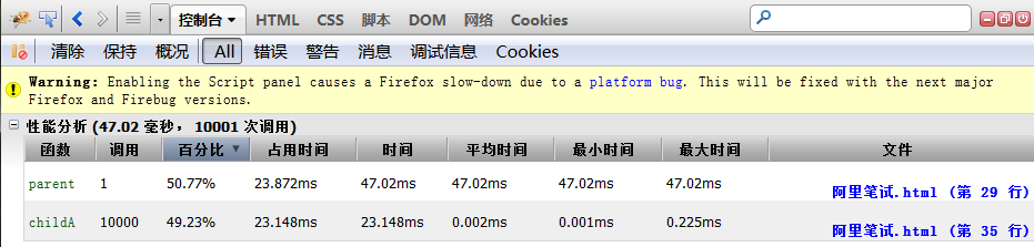 上述代码计算console.profile('性能分析');和console.profileEnd();之间,代码块中涉及的函数的运行效率。