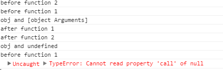 before function 2 before function 1 obj and [object Arguments] after function 1 after function 2 obj and undefined before function 1