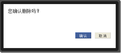 上面的代码很简单,confirm弹出框会有两个按钮,点击确定返回true,点击取消返回false。在boxy插件中也有confirm方法,调用代码如下: