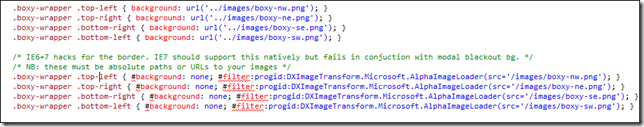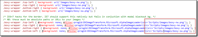 JQuery boxy插件很好用,但也会出现一些问题,比如弹出框的边角在IE中不能显示。本博文将来解决这个问题。将boxy插件引用到项目中后会有一个boxy.css文件和jquery.boxy.js文件。在boxy.css文件中有给弹出框设置四个角图片的样式,如下图:
