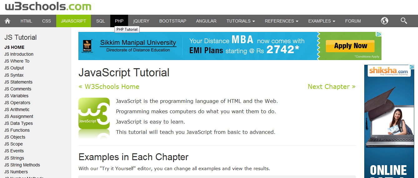 W3Schools是个非常出色的网站,能够帮助大家以在线方式免费学习JavaScript应用。其中的教程在设计思路上涵盖了JavaScript语言的各项基础及高级主题。教程中的每个章节都允许学习者亲手执行操作,并立即看到自己的操作在JavaScript当中会产生怎样的结果。