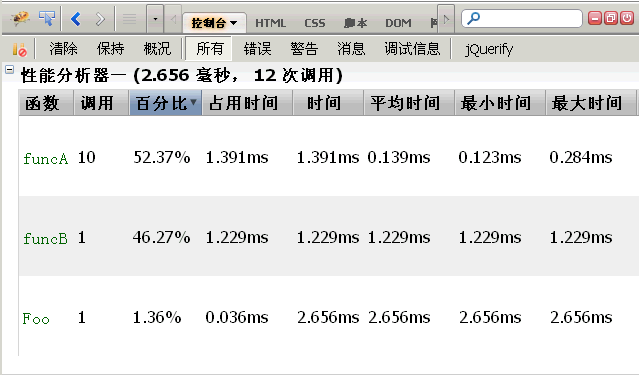 标题栏提示,一共运行了12个函数,共耗时2.656毫秒。其中funcA()运行10次,耗时1.391毫秒,最短运行时间0.123毫秒,最长0.284毫秒,平均0.139毫秒;funcB()运行1次,耗时1.229ms毫秒。