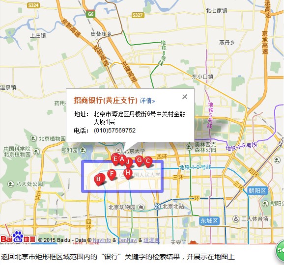 <p>返回北京市矩形框区域范围内的“银行”关键字的检索结果,并展示在地图上</p>