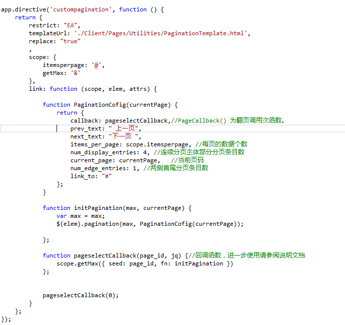 注意事项:jquery控件的调用更多的是使用一种同步的方式,而Angularjs获取后台数据则全部采用的是异步方式,在同时使用jquery和Angularjs时需要注意将两种不同的编程思想结合起来。在本例中最大的问题是在使用Angularjs获取后台数据后如何将新的分页情况通知给jquery分页控件,然后刷新分页控件的页面数据。本例是在Angularjs和jquery代码中各进行一次回调来实现的。其实也可以在Angularjs指令中使用watch来监视分页控件数据的变化达到刷新页面的目的,欢迎各位作进一步的探索。