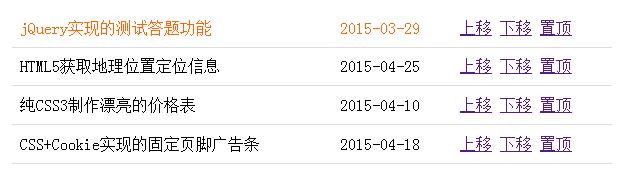 <table class="table"> <tr> <td>HTML5获取地理位置定位信息</td> <td>2015-04-25</td> <td><a href="#" class="up">上移</a> <a href="#" class="down">下移</a> <a href="#" class="top">置顶</a></td> </tr> <tr> <td>CSS+Cookie实现的固定页脚广告条置顶</a></td> </tr> ... </table>