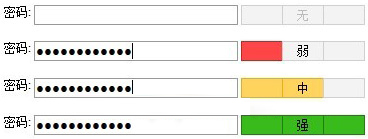 <input name="password" type="PassWord" onKeyUp="CheckIntensity(this.value)"> <table border="0" cellpadding="0" cellspacing="0"> <tr align="center"> <td id="pwd_Weak" class="pwd pwd_c"> </td> <td id="pwd_Medium" class="pwd pwd_c pwd_f">无</td> <td id="pwd_Strong" class="pwd pwd_c pwd_c_r"> </td> </tr> </table>