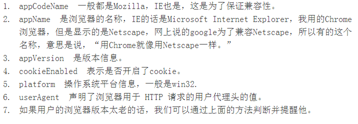 我们可以通过这个函数通知用户浏览器是否应该去更新浏览器,同样也可以帮用户得知浏览器的相关信息