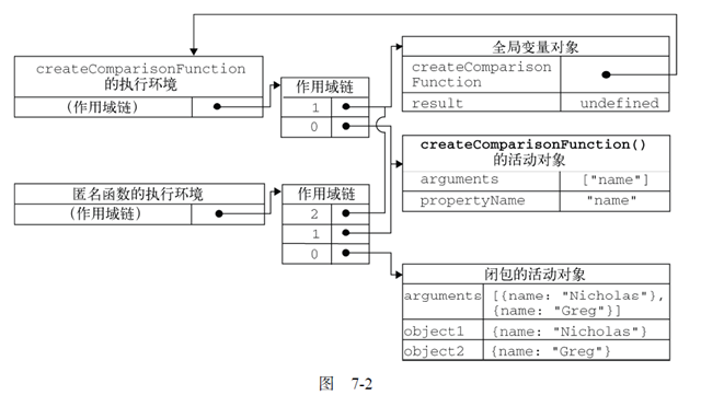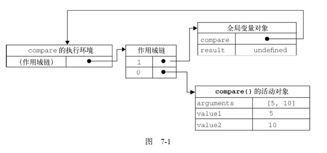 以上代码先定义了compare()函数,然后又在全局作用域中调用了它.当调用compare()时,会创建一个包含arguments,value1,value2的活动对象.全局执行环境的变量对象(包含result和compare)在compare()执行环境的作用域链中则处于第二位
