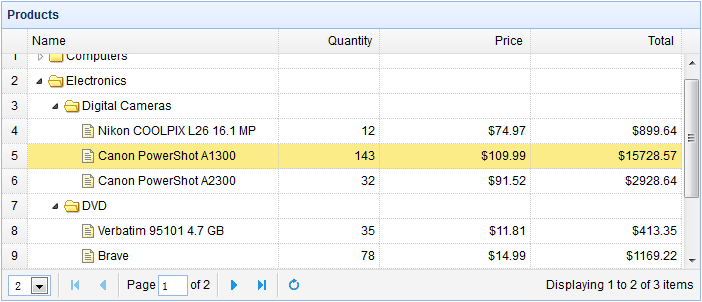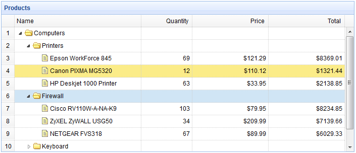 <table title="Products" class="easyui-treegrid" style="width:700px;height:300px" url="treegrid3_getdata.php" rownumbers="true" idField="id" treeField="name"> <thead> <tr> <th field="name" width="250">Name</th> <th field="quantity" width="100" align="right">Quantity</th> <th field="price" width="150" align="right" formatter="formatDollar">Price</th> <th field="total" width="150" align="right" formatter="formatDollar">Total</th> </tr> </thead> </table>