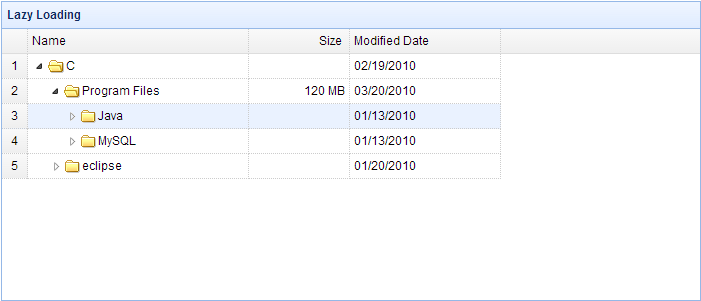 有时我们已经得到充分的分层树形网格(TreeGrid)的数据。 我们还想让树形网格(TreeGrid)按层次惰性加载节点。 首先,只加载顶层节点。 然后点击节点的展开图标来加载它的子节点。 本教程展示如何创建带有惰性加载特性的树形网格(TreeGrid)。