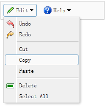 <div style="background:#fafafa;padding:5px;width:200px;border:1px solid #ccc"> <a href="#" class="easyui-menubutton" menu="#mm1" iconCls="icon-edit">Edit</a> <a href="#" class="easyui-menubutton" menu="#mm2" iconCls="icon-help">Help</a> </div> <div id="mm1" style="width:150px;"> <div iconCls="icon-undo">Undo</div> <div iconCls="icon-redo">Redo</div> <div class="menu-sep"></div> <div>Cut</div> <div>Copy</div> <div>Paste</div> <div class="menu-sep"></div> <div iconCls="icon-remove">Delete</div> <div>Select All</div> </div> <div id="mm2" style="width:100px;"> <div>Help</div> <div>Update</div> <div>About</div> </div>