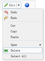 <div style="border:1px solid #ccc;background:#fafafa;padding:5px;width:120px;"> <a href="#" class="easyui-splitbutton" menu="#mm" iconCls="icon-edit">Edit</a> <a href="#" class="easyui-linkbutton" plain="true" iconCls="icon-help"></a> </div> <div id="mm" style="width:150px;"> <div iconCls="icon-undo">Undo</div> <div iconCls="icon-redo">Redo</div> <div class="menu-sep"></div> <div>Cut</div> <div>Copy</div> <div>Paste</div> <div class="menu-sep"></div> <div> <span>Open</span> <div style="width:150px;"> <div>Firefox</div> <div>Internet Explorer</div> <div class="menu-sep"></div> <div>Select Program...</div> </div> </div> <div iconCls="icon-remove">Delete</div> <div>Select All</div> </div>