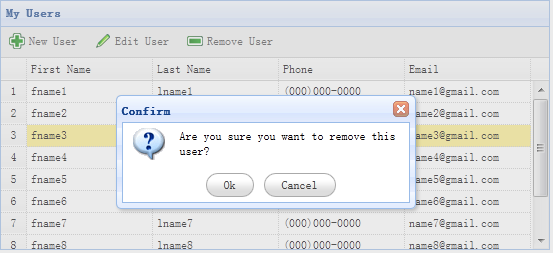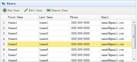 <table id="dg" title="My Users" class="easyui-datagrid" style="width:550px;height:250px" url="get_users.php" toolbar="#toolbar" rownumbers="true" fitColumns="true" singleSelect="true"> <thead> <tr> <th field="firstname" width="50">First Name</th> <th field="lastname" width="50">Last Name</th> <th field="phone" width="50">Phone</th> <th field="email" width="50">Email</th> </tr> </thead> </table> <div id="toolbar"> <a href="#" class="easyui-linkbutton" iconCls="icon-add" plain="true" onclick="newUser()">New User</a> <a href="#" class="easyui-linkbutton" iconCls="icon-edit" plain="true" onclick="editUser()">Edit User</a> <a href="#" class="easyui-linkbutton" iconCls="icon-remove" plain="true" onclick="destroyUser()">Remove User</a> </div>