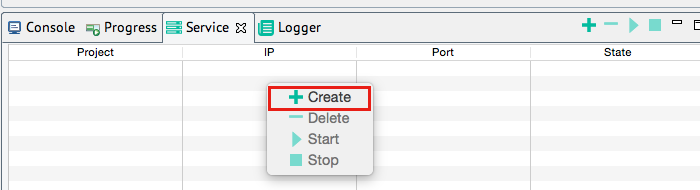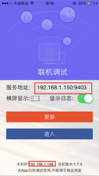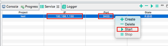 在移动设备(手机或pad)上安装上一个步骤生成的安装包之后,基本界面如下,Android,IOS和Winphone基本界面是一样的。要调试需要先在设计器中的”Service”右键点击”Create”按钮,然后点击“Start”启动服务,记录下显示的ip地址和port号,再将ip地址输入手机上调试版本的“服务地址”,注意要确保手机的ip和设计器所在ip在同一网段,否则无法通信。最后再点击”更新“按钮