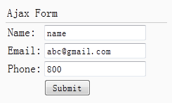 <div style="padding:3px 2px;border-bottom:1px solid #ccc">Ajax Form</div> <form id="ff" action="form1_proc.php" method="post"> <table> <tr> <td>Name:</td> <td><input name="name" type="text"></input></td> </tr> <tr> <td>Email:</td> <td><input name="email" type="text"></input></td> </tr> <tr> <td>Phone:</td> <td><input name="phone" type="text"></input></td> </tr> <tr> <td></td> <td><input type="submit" value="Submit"></input></td> </tr> </table> </form>