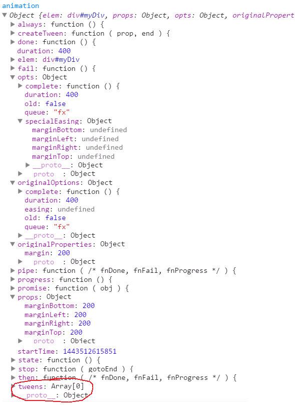 Animation ( elem, properties, options ). properties是要进行动画的css特征,options是动画相关选项{complete: function () {…},duration: 400,easing: undefined,old: false,queue: "fx"}。