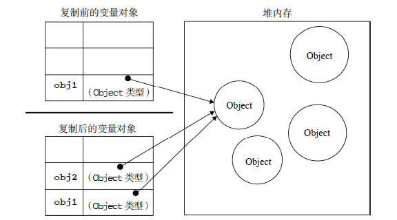 当从一个变量想另一个变量复制引用类型的的值时,也会将该值复制一份放到新的空间中。但是就跟上面说的一样,引用类型的存储要栈内存和堆内存一起完成,这个值实际上是一个指针,而这个指针指向存储在堆中的一个对象。复制操作结束后,俩个变量实际上是同一个指针,也就是引用同一个对象。所以,改变其中的一个变量,另一个变量也会随之改变。如下图: